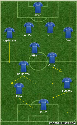 My starting 11 to freshen things up would possibly be: Cech, Betrand, Cahill, Terry, Azpi, Essien, Ramires, Mata, Hazard, De Bruyne, Torres