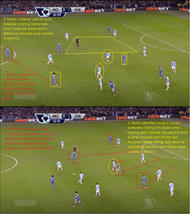 Gary Neville and Jamie Carragher were almost in disbelief as they viewed clip after clip of Matić bullying Touré. Yes, Touré still triumphed in a few battles but the war was unequivocally won by the Serbian. His power, reading of the game, tackling and drive with the ball rendered City’s powerhouse almost obsolete after an early settling in period. Matić showed he is capable of quickly regaining possession and pinging passes forward quickly and it was a welcome change of pace to both Ramires and Obi Mikel.